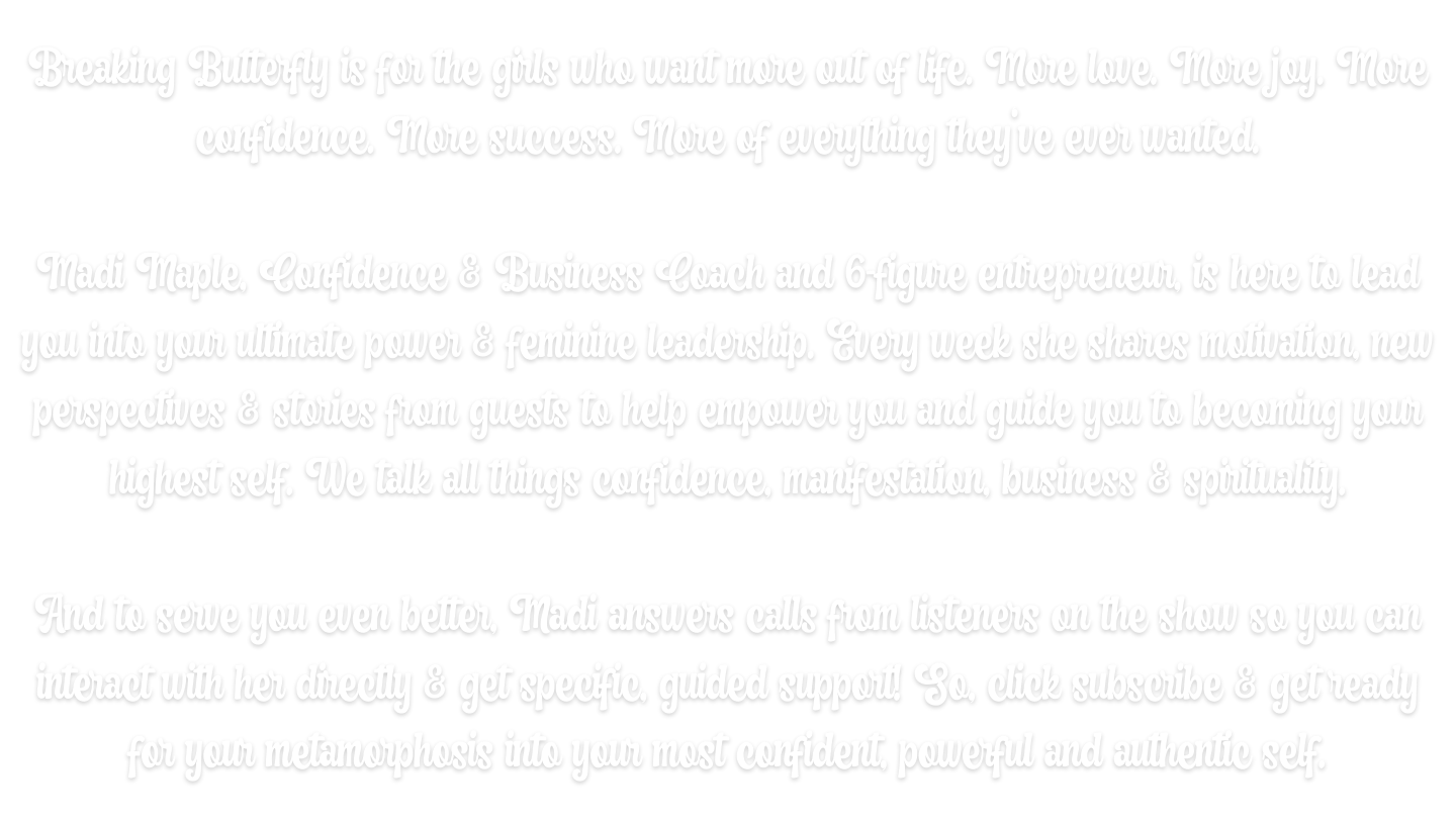Welcome to Breaking Butterfly! My favorite place to hangout :) I can't wait to chat all things confidence and manifestation with you.