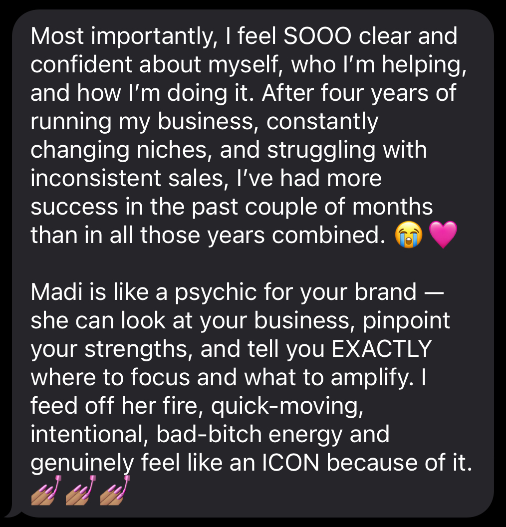Madi is like a psychic for your brand — she can look at your business, pinpoint your strengths, and tell you exactly where to focus and what to amplify. I feed off her fire, quick-moving, intentional, bad-bitch energy and genuinely feel like an ICON because of it.