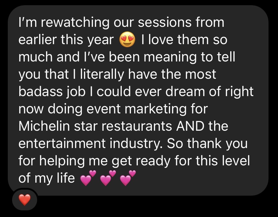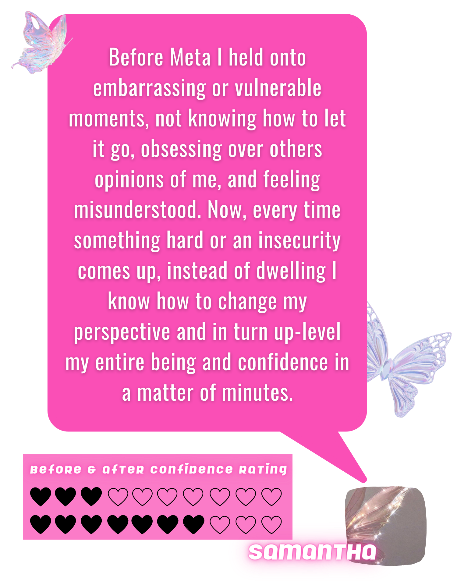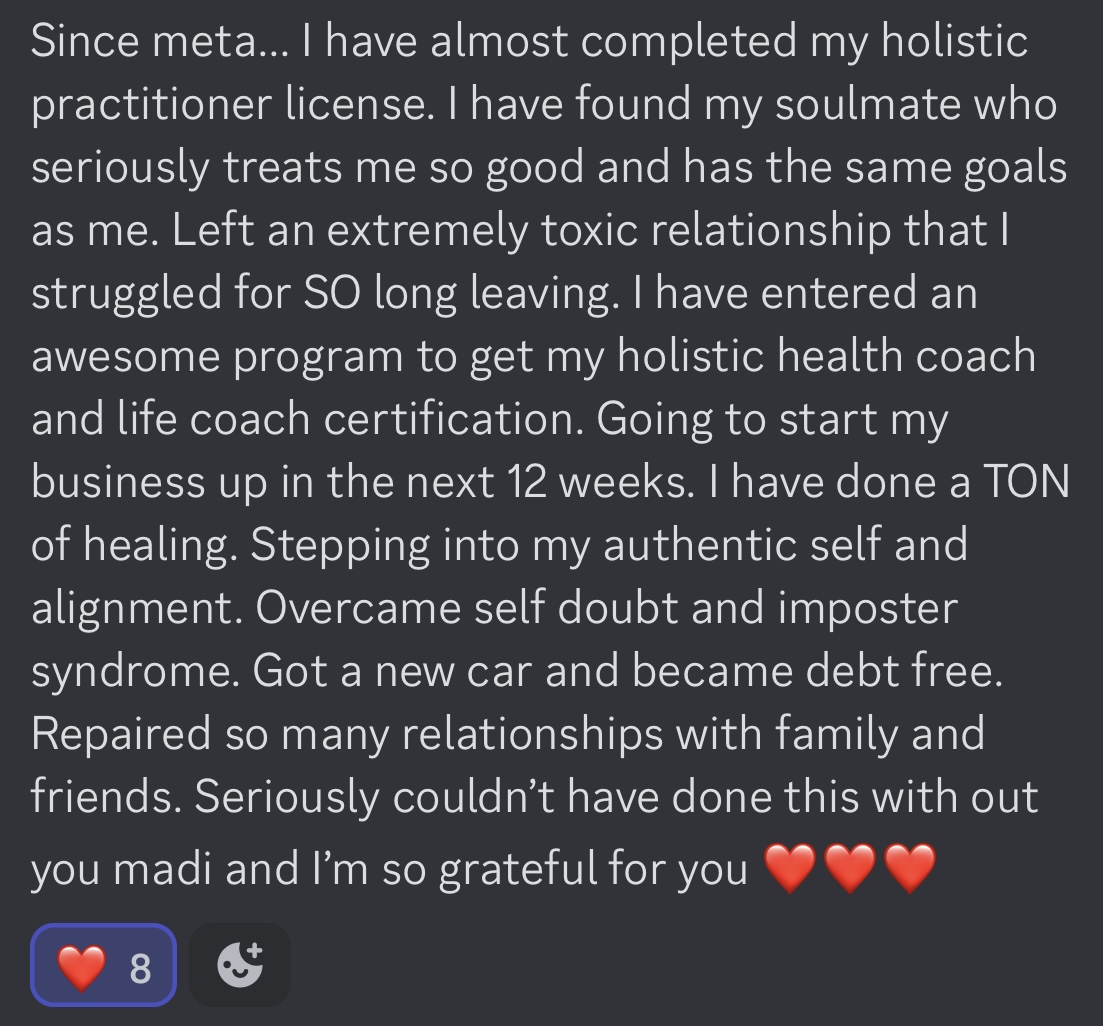 During Meta I found clarity on my desires, ended a 3-year relationship which was holding me back, figured out the next step in my business, and opened myself up to the possibility of abundance (in both my personal and professional life... I am now working my dream job of doing marketing for Michelin Star restaurants & the entertainment industry!)