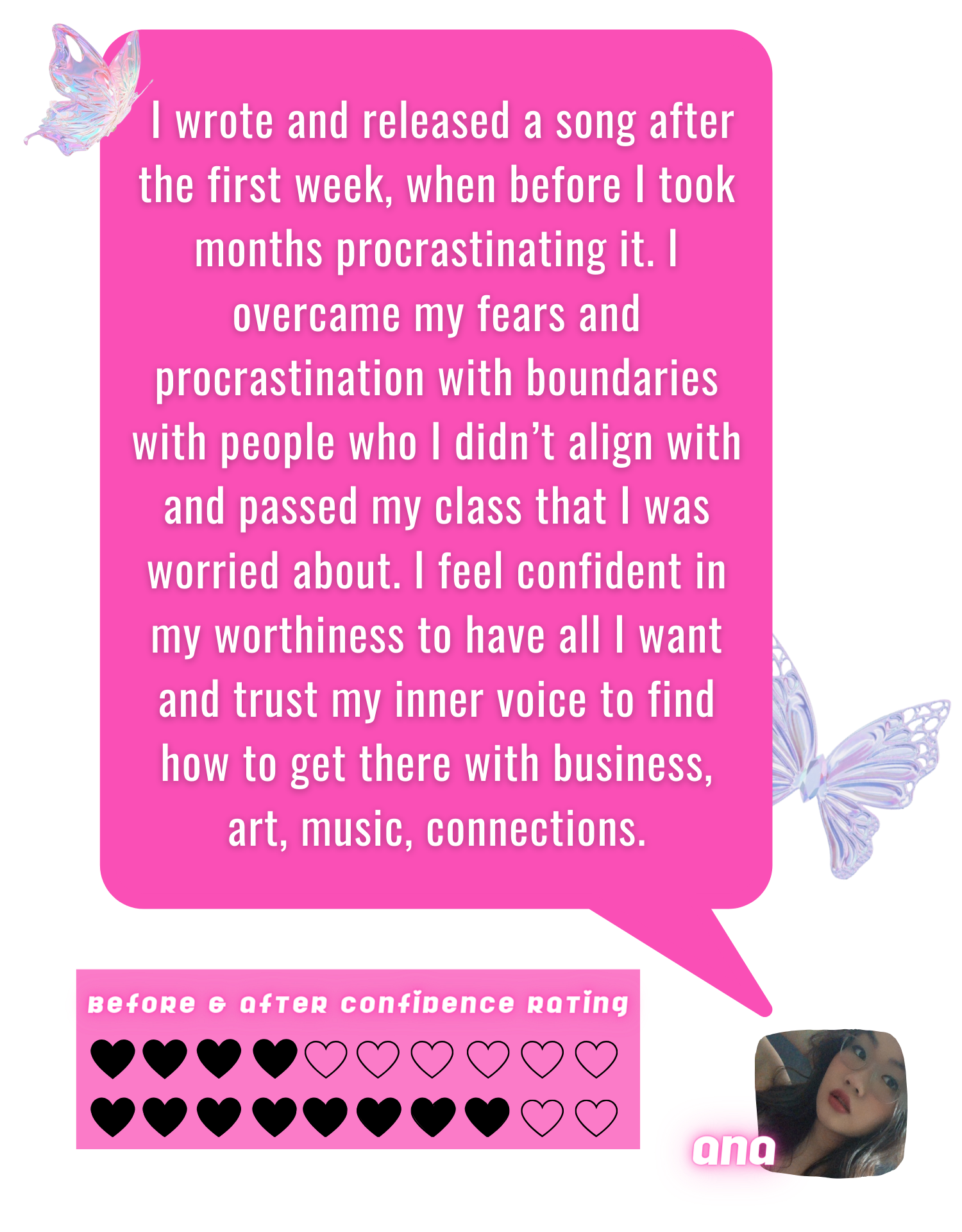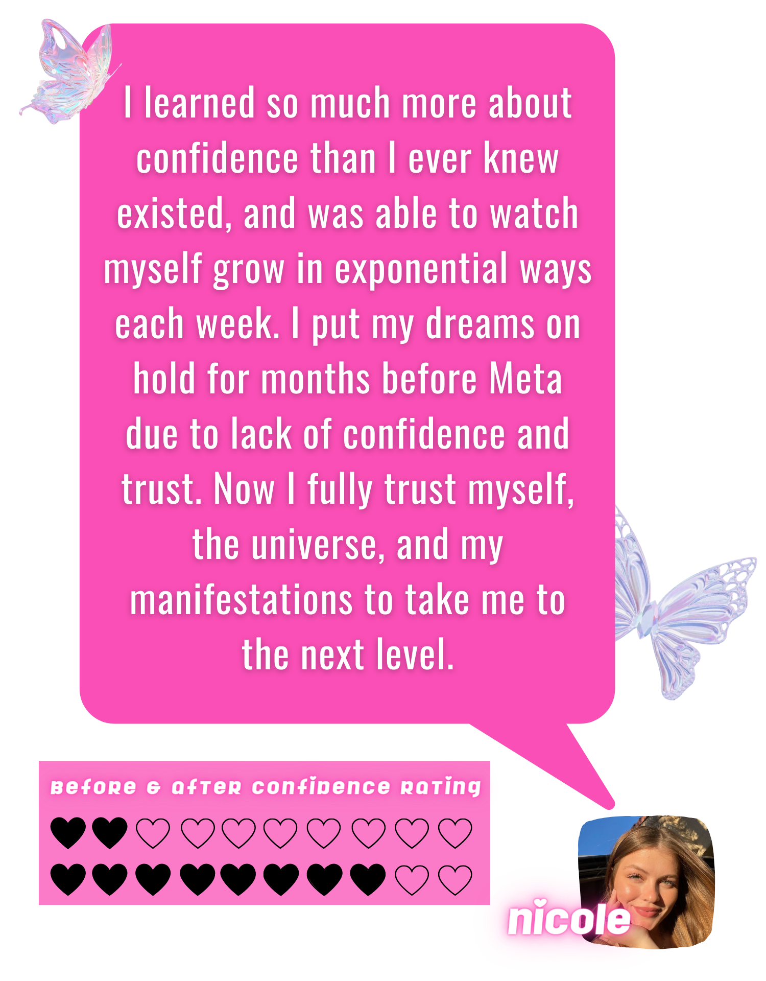 In our last 4 modules, you will fully INTEGRATE your confidence and learn to hold your confidence in your relationships, on social media, while living out your purpose. We will finish the transformation by channeling your newfound confidence into creating your life (AKA manifestation) and activate your self-expression and leadership. This is where your confidence will start to manifest into your dream life.