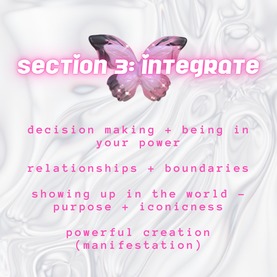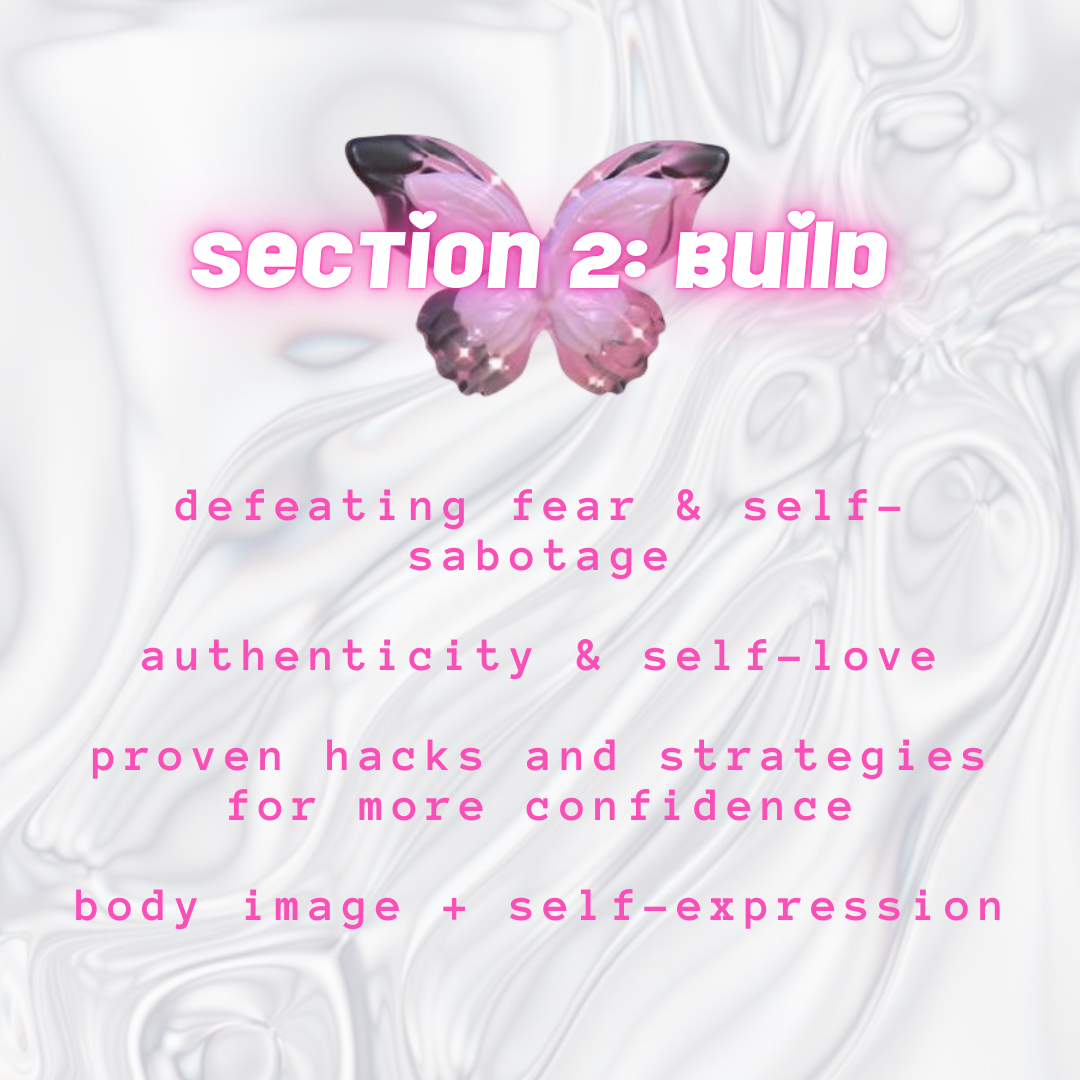 In the first 4 modules of the Metamorphosis program, we first commit to confidence & learn what confidence truly is. Then, you will fully release anything not serving you. Say good-bye to self-doubt, imposter syndrome, overthinking, fear, limiting beliefs, insecurity, caring what people think of you... anything holding you back from your highest self.
