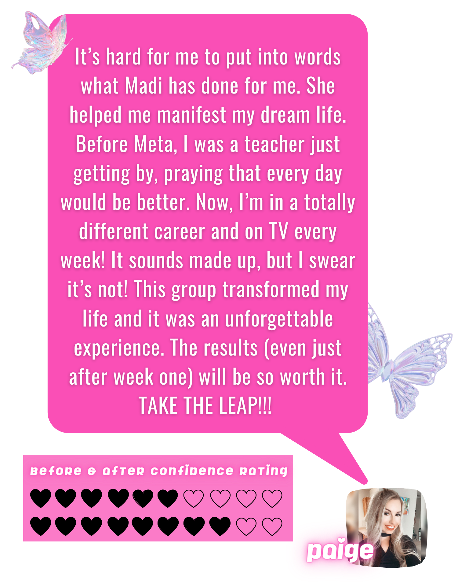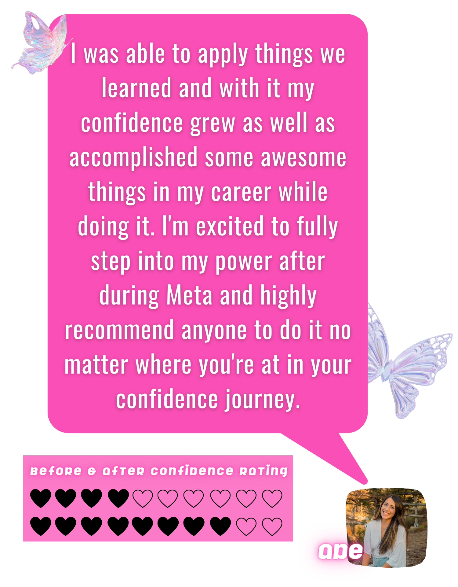 In Metamorphosis, you'll finally stop sitting on ideas and start taking action... building the business, going on the RIGHT dates, saying YES to the life thatβs been calling you.